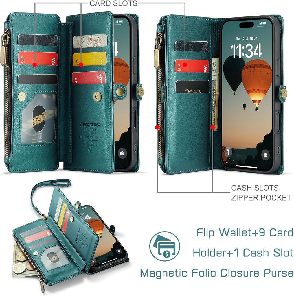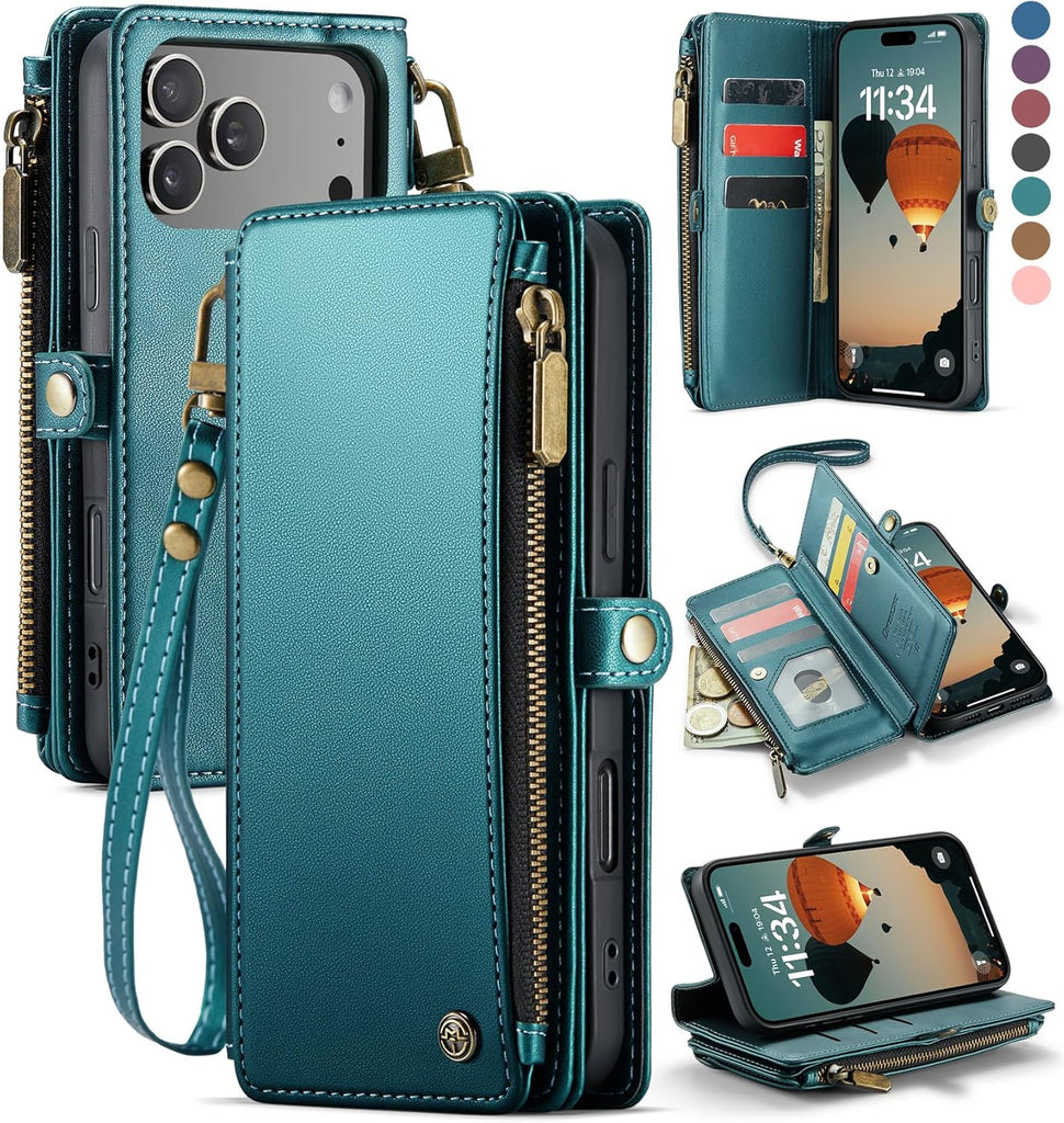 Konstreet Compatible with iPhone 17 Pro Case Wallet with RFID Blocking Card Holder for Women and Men, PU Leather Magnetic Snap Flip Zipper Strap Wallet Phone Case for iPhone 17 Pro 6.3", Blue Green